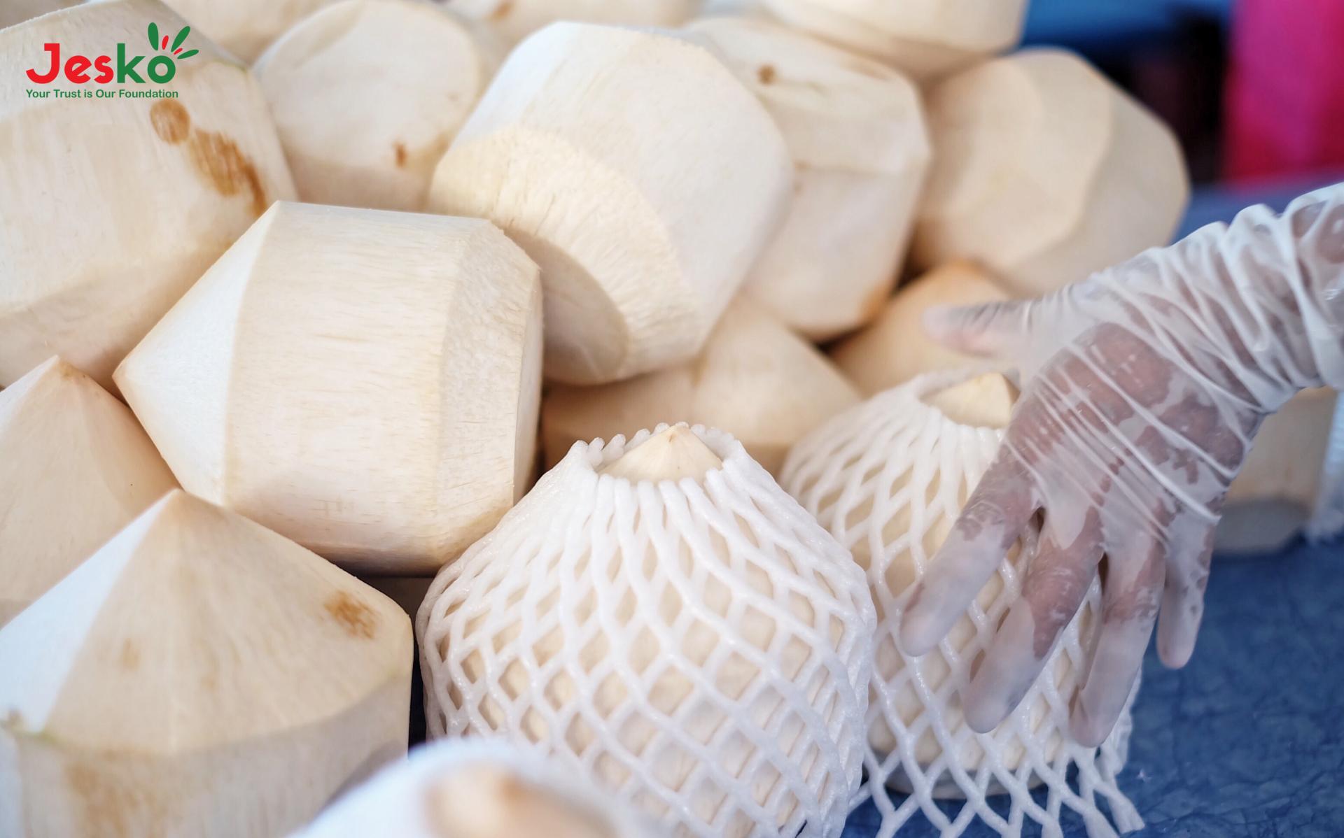 Coconut water quality is impact-sensitive too much shaking or drop height clouds the water and lowers pH. Jesko’s farmers and logistics teams minimize vibration, use padded handling, and apply rapid pre-cooling to maintain clarity and flavor integrity.